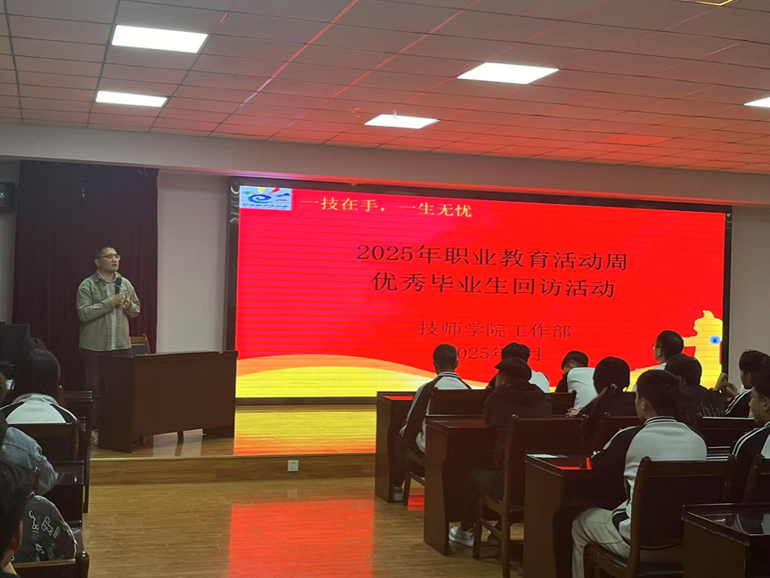 5月13日,技师学院工作部结合2025年职业教育活动周工作安排,以“一技在手,一生无忧”为主题开展优秀毕业生回访活动。本次活动通过线上和线下结合的方式开展,邀请我院2015级数控加工专业优秀毕业生蹇昊江和2016级电气自动化设备安装与维修专业优秀毕业生何如海,两位优秀学子分享了他们求学、职业发展的历程。活动由副主任任军晓主持,班主任代表和在场的100余名学子聆听了他们的励志成长故事。