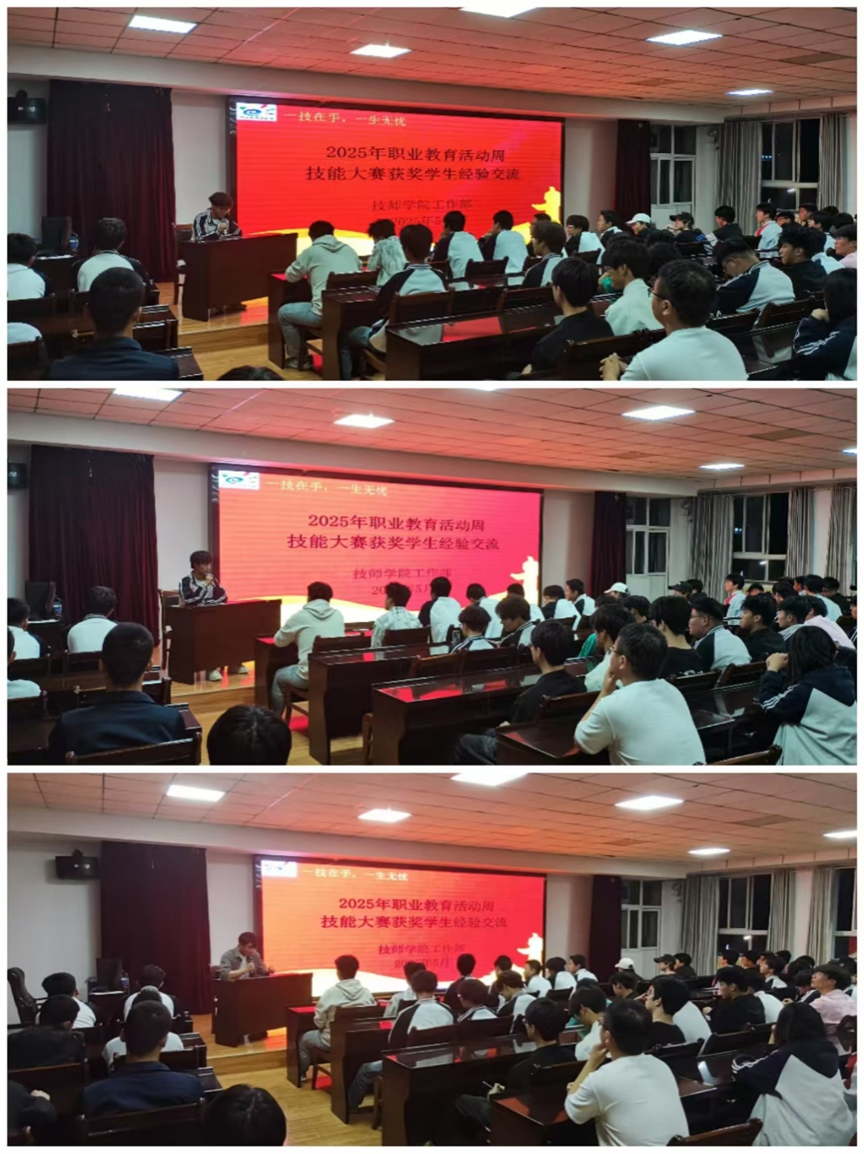 5月12日,技师学院工作部结合2025年职业教育活动周工作安排,以“一技在手,一生无忧”为主题举行技能大赛获奖选手经验分享活动。本次活动由副主任任军晓主持。技能大赛指导老师和2025年全省技能大赛获奖选手参加了活动,100余名2023级、2024级学生代表现场聆听。