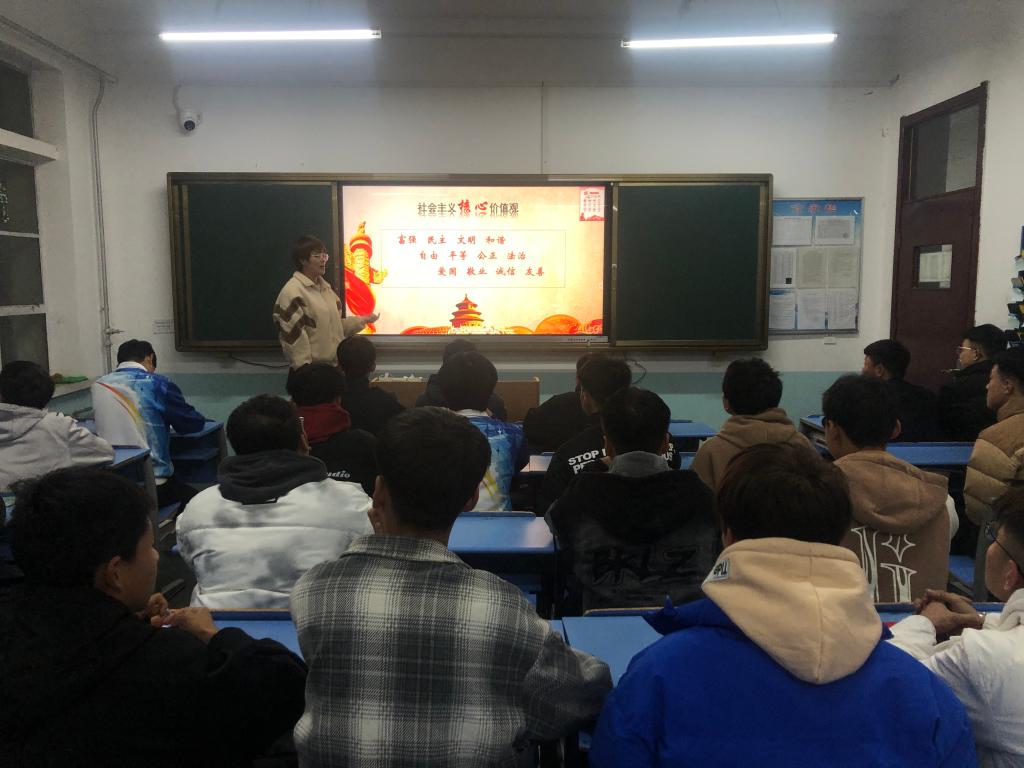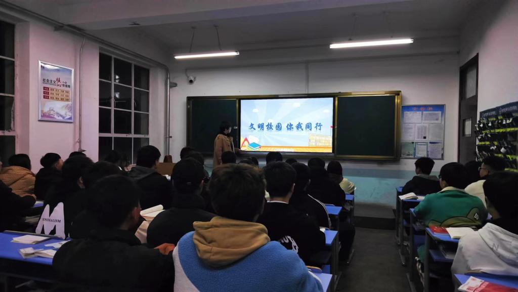 在主题班会中,为促进文明校园建设,辅导员老师对各位同学进行社会主义核心价值观宣传教育,让同学们熟记社会主义核心价值观的12个主题词,组织同学们学习《学院学生管理制度》。