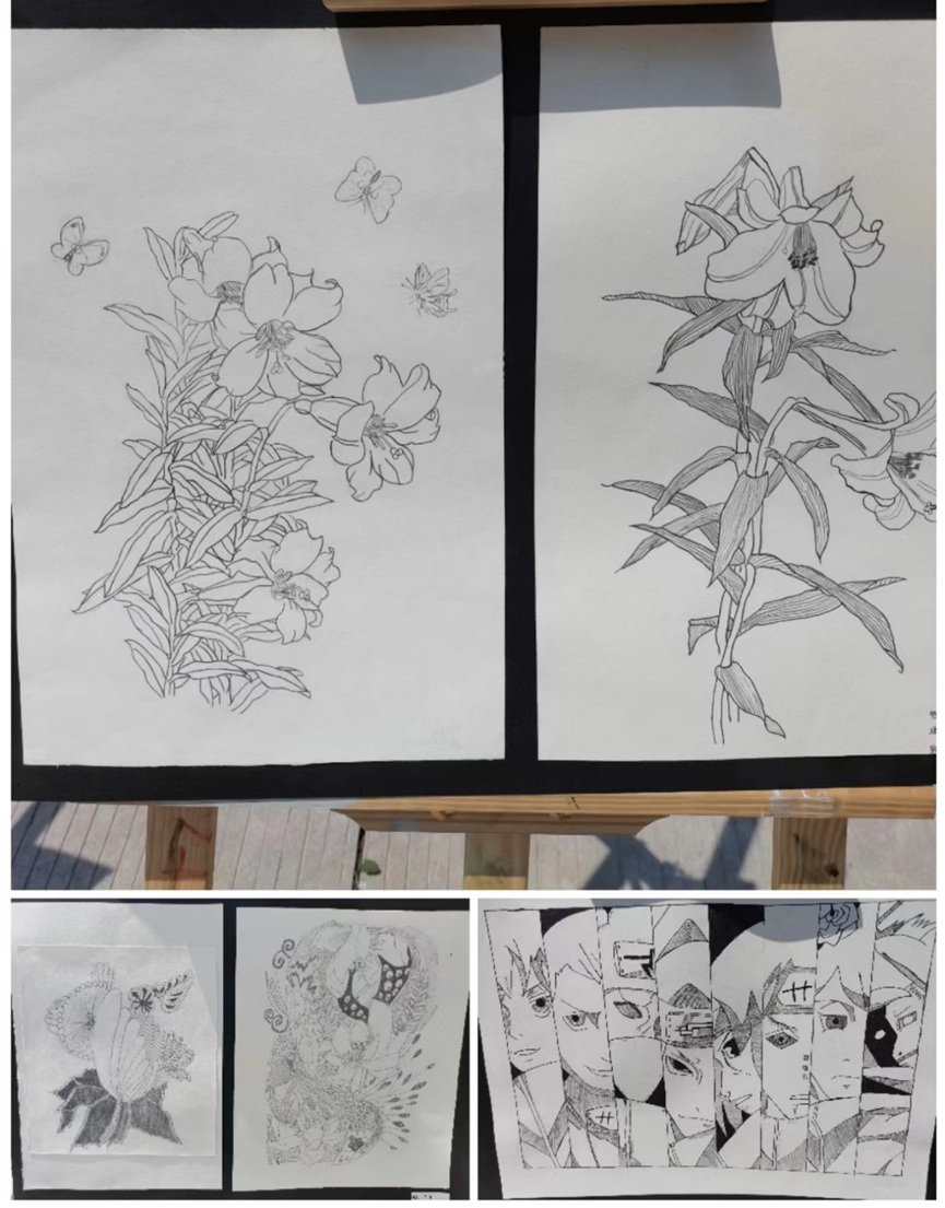 活动中,技师学院收集了JS22071班《实用美学鉴赏》课程的学生作业。学生以专业知识为基础,自由创作,充分运用自己的创造性思维,以手绘的形式画出自己心中所想所感。画板中,每一朵绽放的花朵是学生对美好事物的向往,一个个卡通动漫人物,是自己儿时无忧无虑的童年回忆……