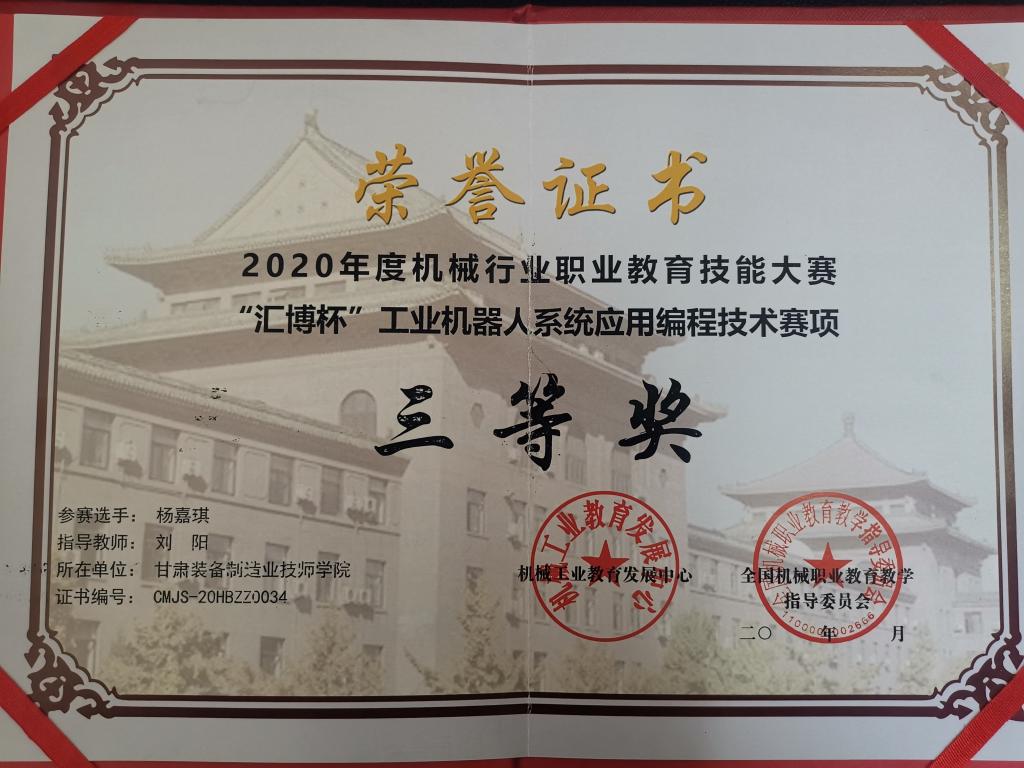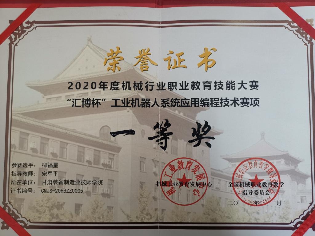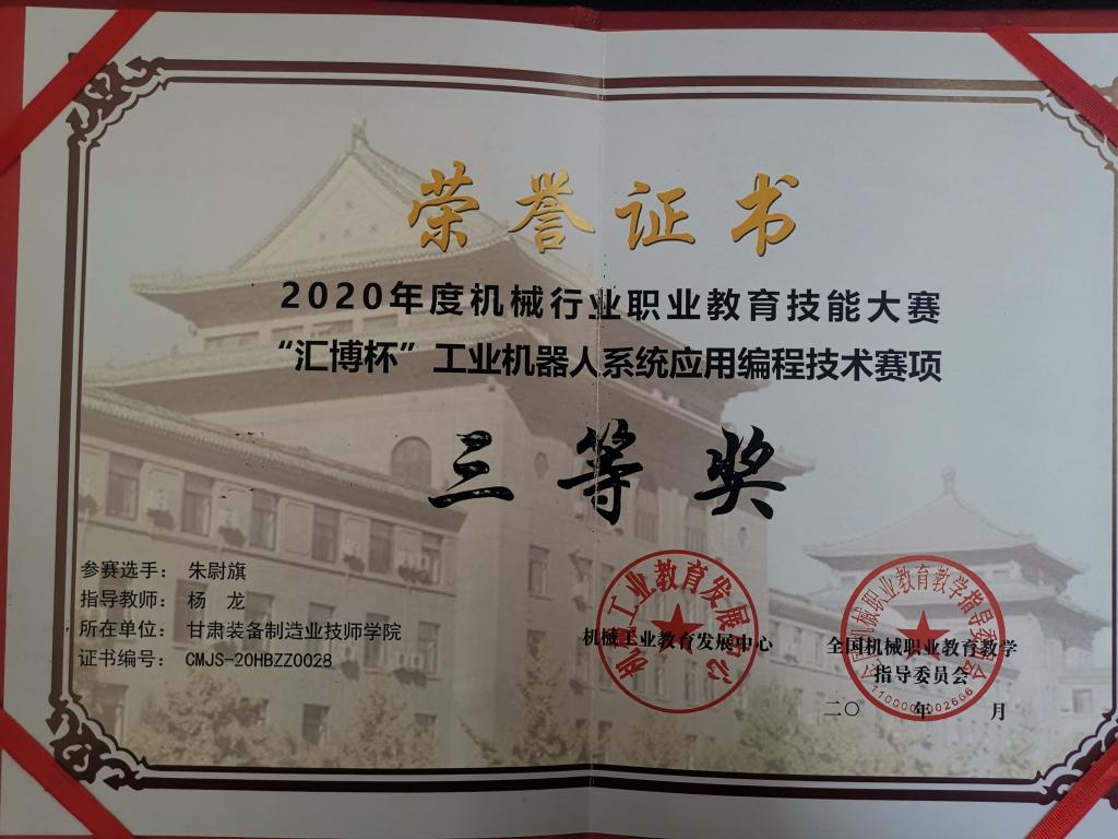 祝贺我部工业机器人兴趣小组成员柳福星、朱尉旗、杨嘉琪在我校举办的2020年机械行业职业教育技能大赛“汇博杯”中取得中职组一个一等奖、两个三等奖的优异成绩!希望其他同学以此为榜样,努力学习、刻苦钻研,以技能成就梦想!