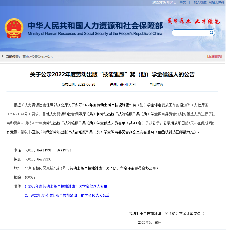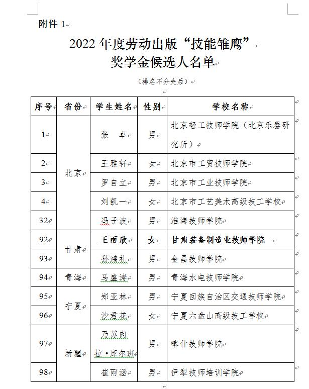 从人社部办公厅传来消息,甘肃装备制造业技术学院王雨欣同学入选2022年度“技能雏鹰”助学金候选人。