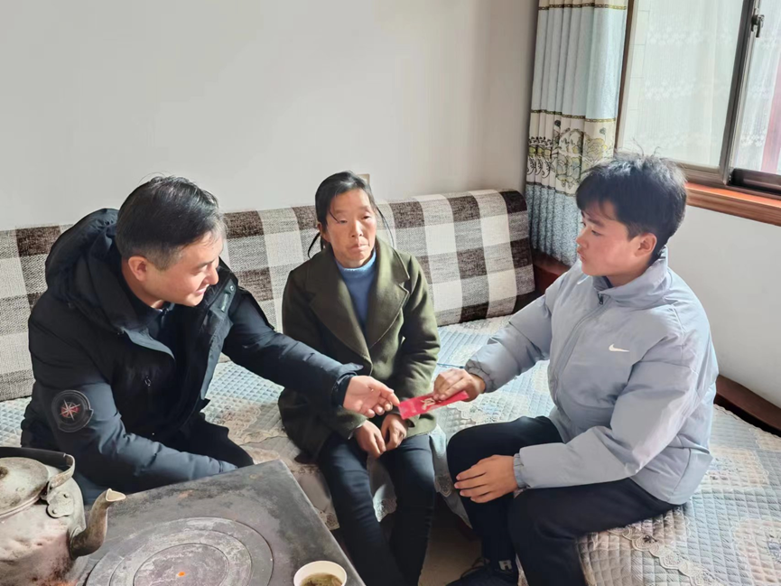 岁末年终,春节将至,为贯彻落实资助政策,提升资助育人质量,做好资助育人工作,传递学院的关爱和温暖,增强学生归属感和幸福感,1月30日,学院党委委员、副院长杨俊,技师学院工作部主任谢宏斌、主任助理李小军一行先后到达秦州区藉口镇三合村、秦州区关子镇柳沟村、秦州区中梁镇草胡村、秦州区秦岭镇大庄村、麦积区马跑泉胡王村对崔宏岩、杨国文等同学进行了走访慰问。