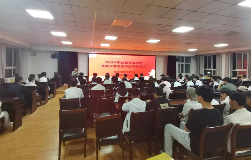 5月12日,技师学院工作部结合2025年职业教育活动周工作安排,以“一技在手,一生无忧”为主题举行技能大赛获奖选手经验分享活动。本次活动由副主任任军晓主持。技能大赛指导老师和2025年全省技能大赛获奖选手参加了活动,100余名2023级、2024级学生代表现场聆听。