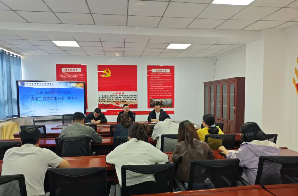 会议强调,校园安全是学校管理的头等大事,不仅关系学生的个人安危,更关乎学生家庭的幸福安宁,以及学校教育事业的高质量发展和教育强国建设,要以“时时放心不下”的责任感筑牢校园安全防线。一是深化安全教育,筑牢安全防线。要高度重视学生安全教育,在“双节”学生离校前召开主题班会,通过多种方式提升学生安全防范意识和自我保护能力。二是严格请销假管理,精准掌握动态。要严格执行学生请销假制度,建立完善的学生假期去向台账,掌握每名学生的假期行程。三是全面排查隐患,营造安全环境。在放假前组织开展学生公寓卫生安全隐患排查,重点检查公寓用电安全、消防安全、卫生状况等。四是向学生告知学校学生投诉受理联系方式,提升突发事件应急处置能力,切实筑牢校园安全防线,为全体师生度过平安祥和的假期提供坚实保障。