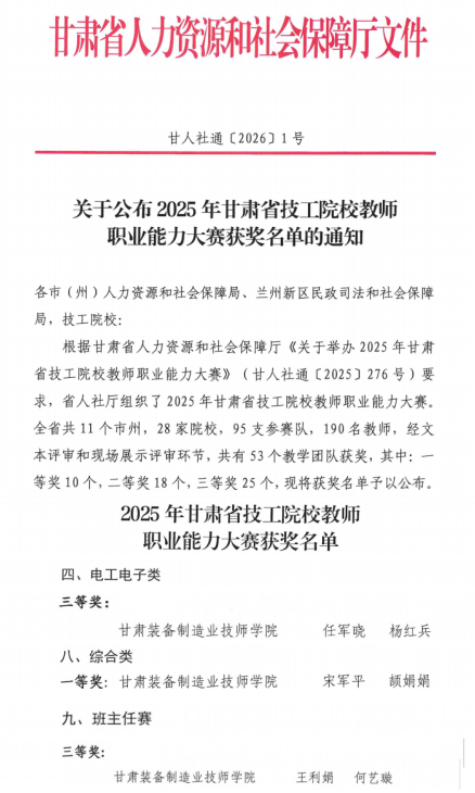 2025年12月11日,由甘肃省人力资源和社会保障厅主办的2025年甘肃省技工院校教师职业能力大赛圆满落幕。我校参赛教师凭借扎实的专业功底、创新的教学设计和出色的表现在190名参赛选手中脱颖而出,荣获一等奖1项,三等奖2项。